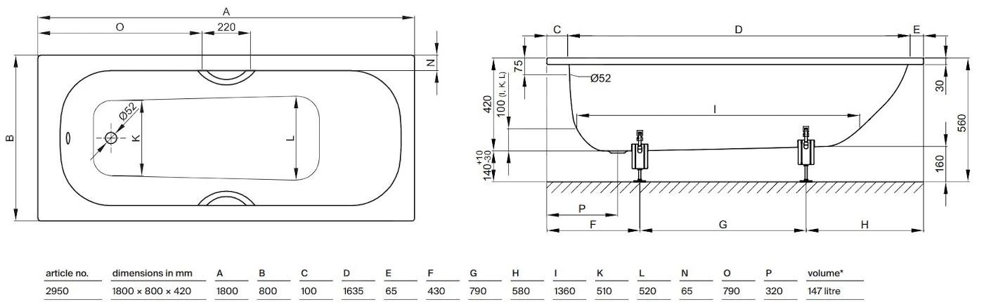 Badpoten en afvoer- en overloopgarnituur met een lengte van 560 mm niet meegeleverd, moeten apart worden besteld.