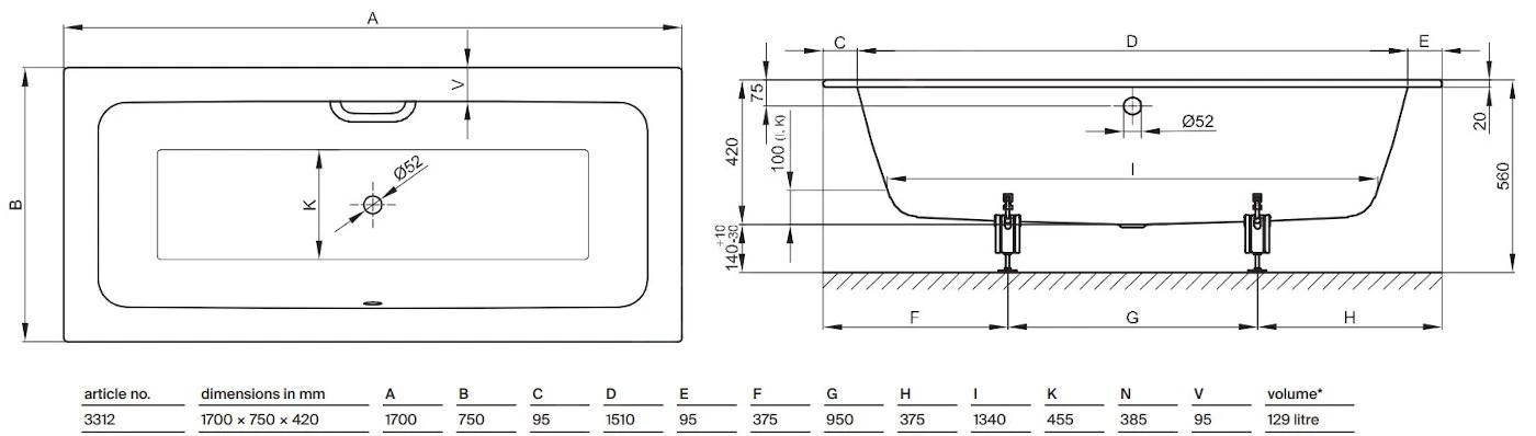 Badpoten en afvoer- en overloopgarnituur met een lengte van 725 mm niet meegeleverd, moeten apart worden besteld.