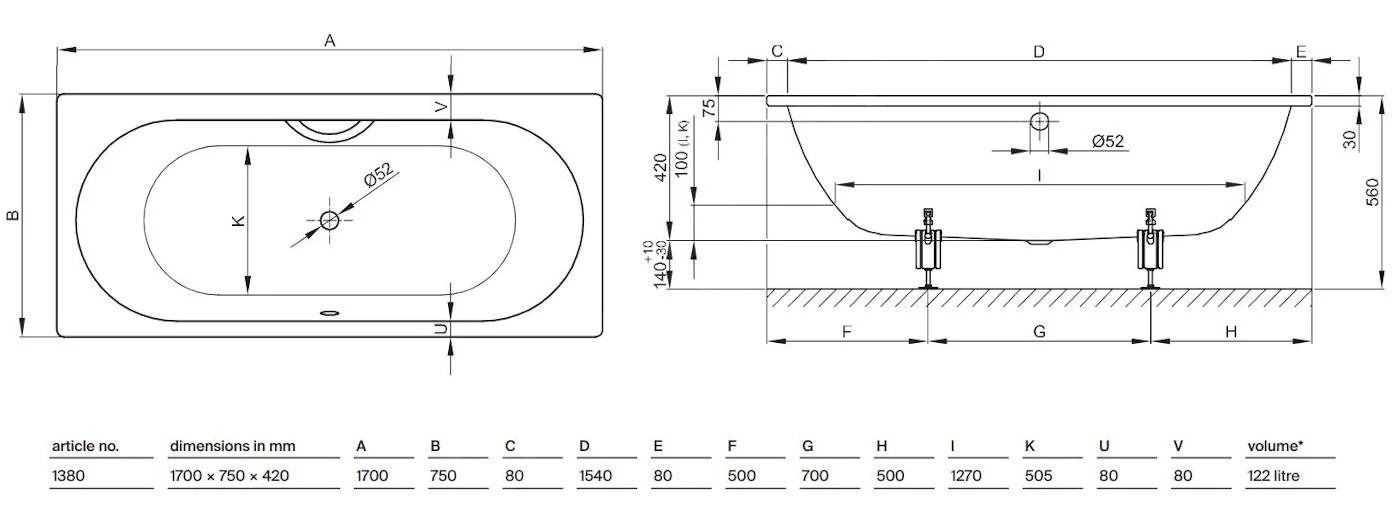 Badpoten en afvoer- en overloopgarnituur met een lengte van 725 mm niet meegeleverd, moeten apart worden besteld.