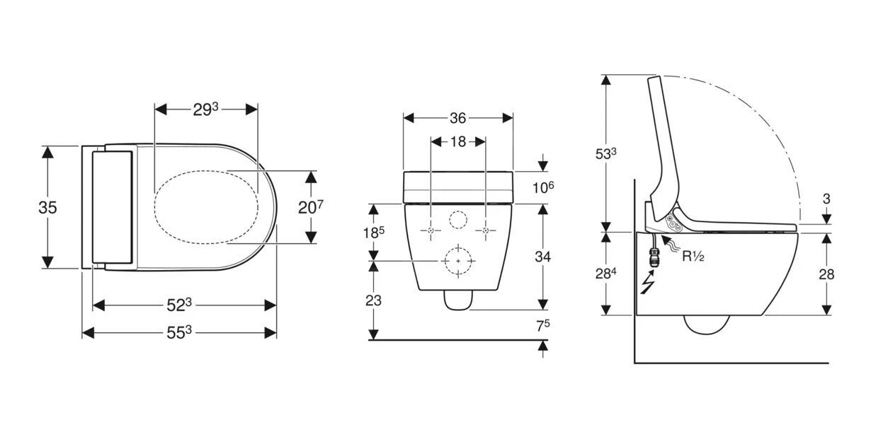 - elektriciteitsaansluiting met drieaderige flexibele ommantelde kabel, aan de rechterzijde verborgen achter de wc-keramiek