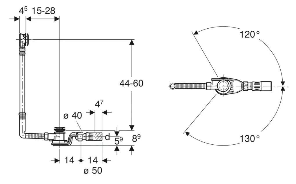 Afvoergarnituur voor baden d52, hoogte 60 cm