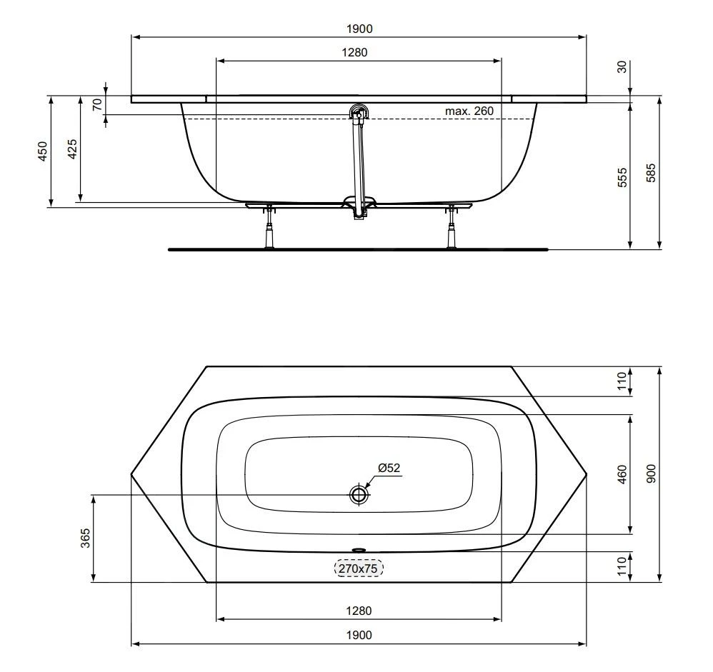 - afvoergat in het midden: diameter 52 mm