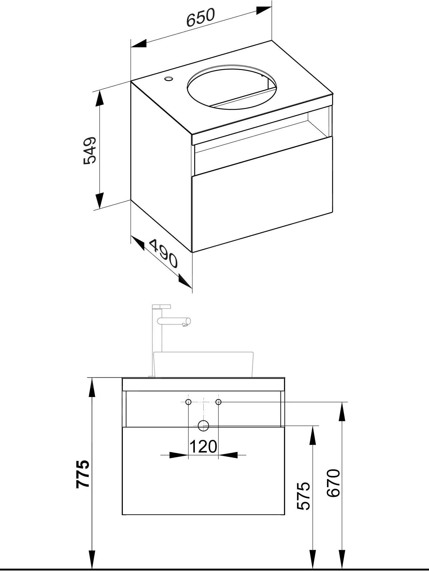 Kast onder ronde wastafel, gat voor wastafel en kraan aan de linkerkant, inclusief sifon