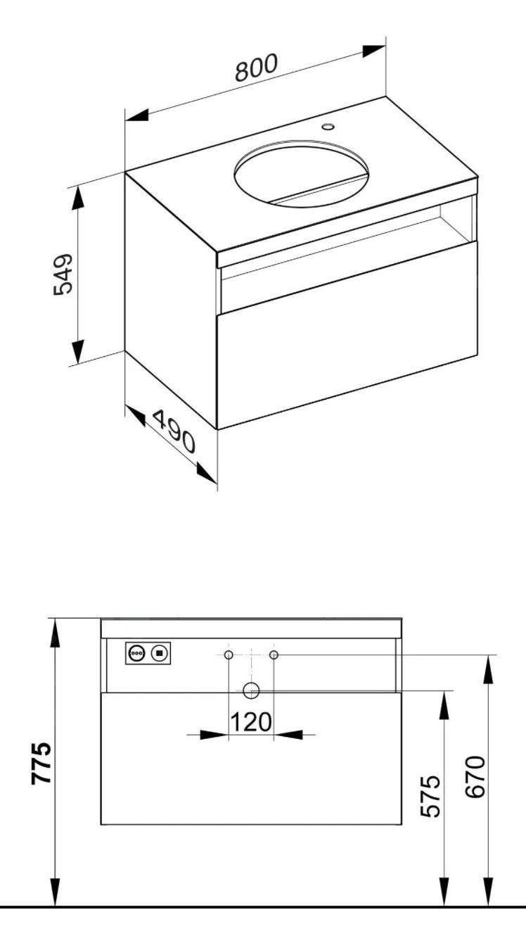 Kast onder ronde wastafel, gat voor wastafel en kraan aan de rechterkant, inclusief sifon
