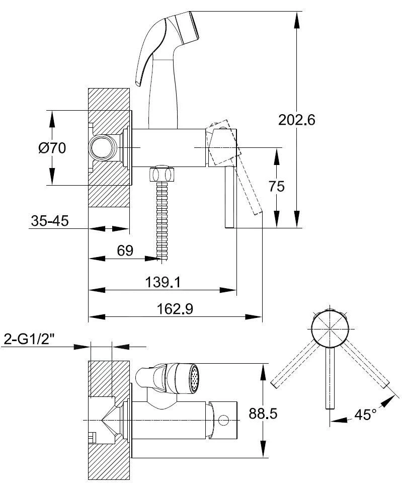 - met douchehouder, metalen slang en douchekop met stopkraan